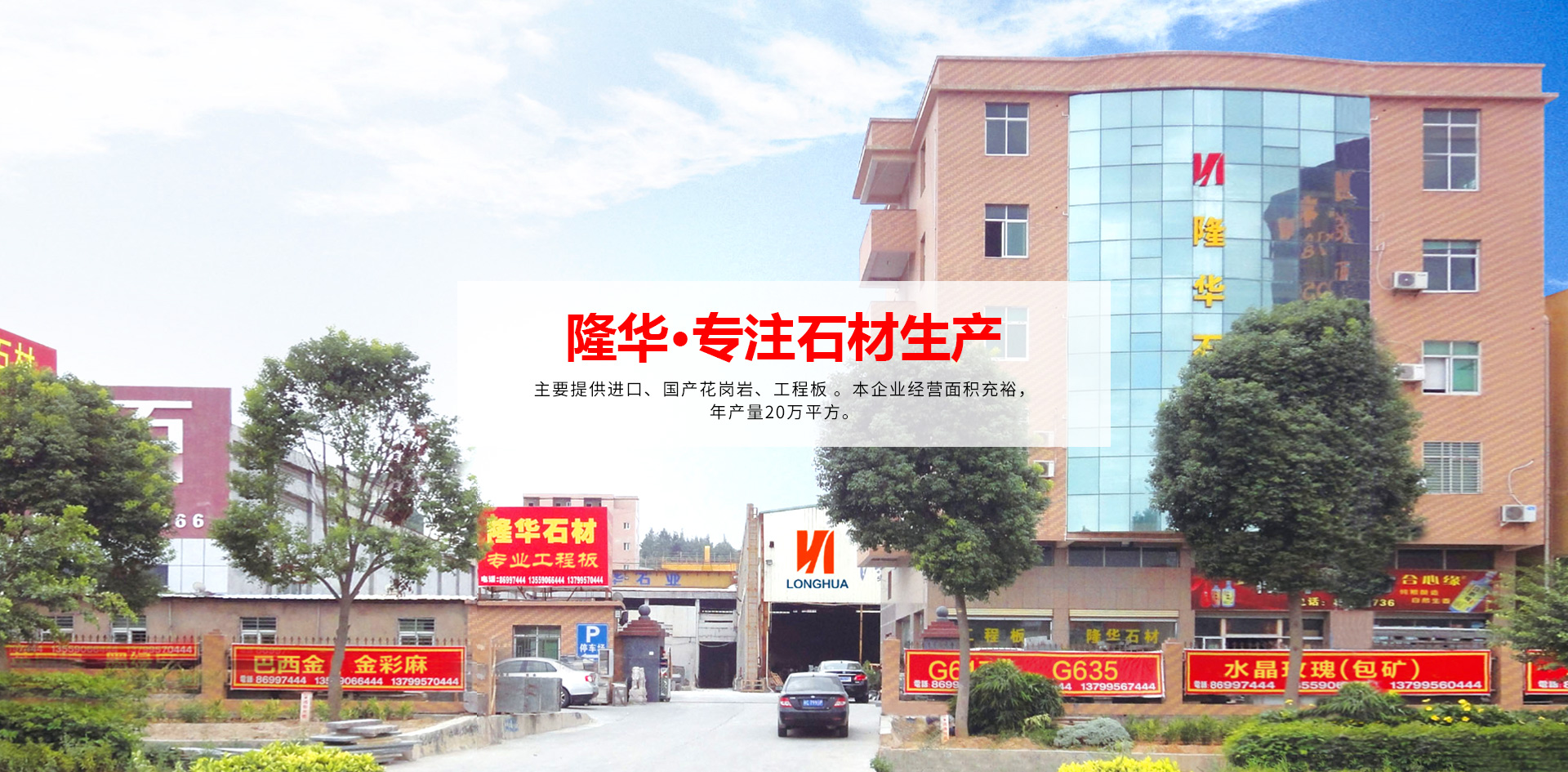 ??福建省南安市隆華石材有限公司注冊資金3000萬元人民幣,位于位于素有“石材之鄉”美譽的福建省南安市水頭西錦工業區康利對面,地理位置優越。公司主要加工銷售各種花崗巖石材及大理石精加工,具備生產供應圓形、異型、平板、薄板等工藝石品的綜合能力,設備配套齊全。目前已配備橋切機多臺,全自動磨光機2臺,紅外線切邊機多臺,行吊多臺,叉車多部,擁有繩鋸、線條機、雕刻機等齊全的配套設備及相關的完善供配電系統、機械維修設備等。